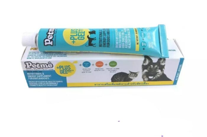 - Petme Plus Gel is nutritional supplement for dogs and catscompositing essential fatty acid,multivitamin, minerals and trace elements. The balanced formulationalso promoteoptimalhealth for your pets.Plus Gel is the best for sick and poor condition of dogs and cats, anorexia, malnutrition. Especially forrapidly growing young pets, periods of gestation orlactation, recovery following illness and surgery, or maintenances of healthy skin and coat.Dogs and cats under10 Kg, feed directly 1 teaspoonevery 4-6 hours.Dogs over15 Kg, feed directly 2 teaspoon every 4-6 hours.(1 teaspoon is about6 g.)It can also be placed in a dish or on a plate or mixed with food during feeding time. Store at roomtemperaturePacking :30 grams.